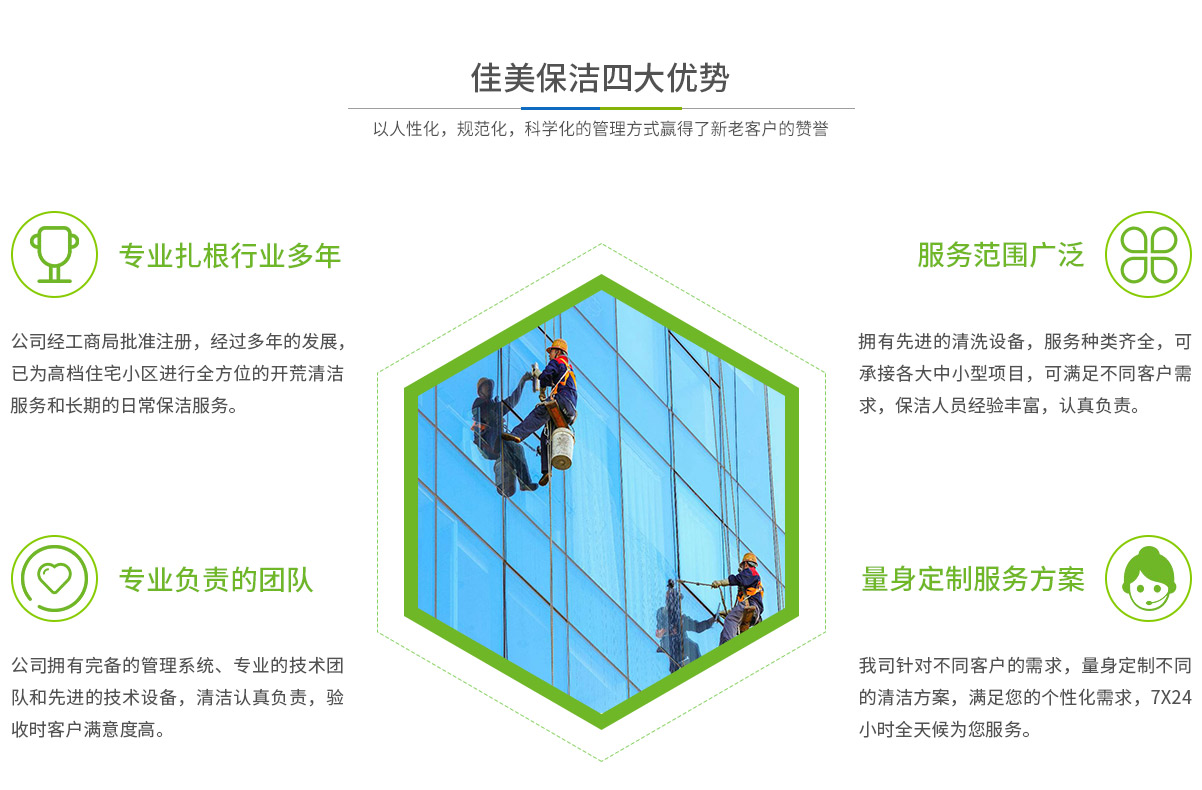 - 馬鞍山市佳美保潔服務(wù)有限公司是一家經(jīng)工商部門(mén)批準(zhǔn),具有法人資格專業(yè)清洗,馬鞍山保潔服務(wù)的公司,自創(chuàng)辦以來(lái),一直致力于企業(yè),家庭,賓館,學(xué)校,別墅,酒店,商廈,公共設(shè)施等場(chǎng)所提供科學(xué)的日常保潔和清潔保護(hù)的服務(wù)公司,有著豐富的管理服務(wù)和保潔經(jīng)驗(yàn)...